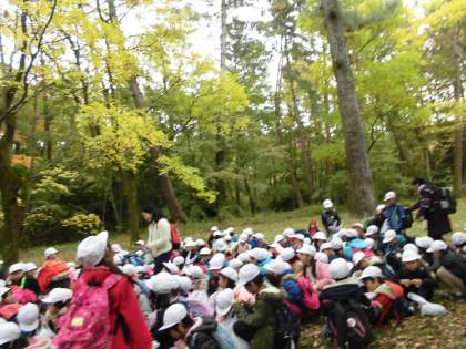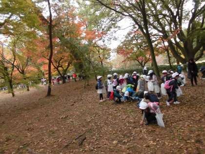 子どもたちは,今後の作品づくりに生かすため,落ちている木の葉や木の実を一生懸命集めています。