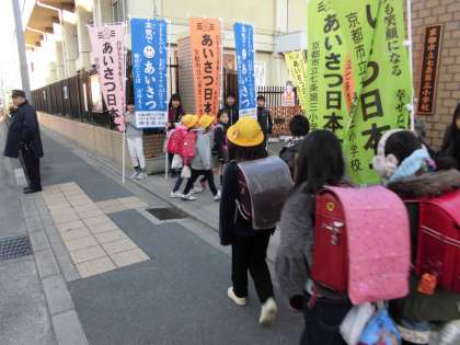 自分たちで考えたようで,今日は「あいさつ日本一」ののぼりを手にあいさつをしています。
