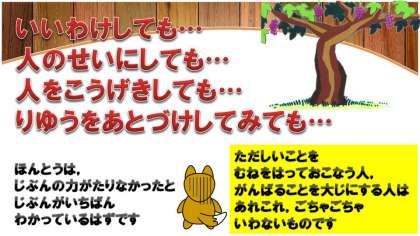 「なりたい自分」をめざすには,「いいわけしない」「だれのせいにもしない」「人をこうげきしない」「あれこれ理由をあとづけしない」ことが大切なのです。
