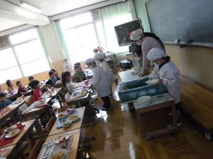 みんなで分担しながら,落とさないように気をつけて配膳します。