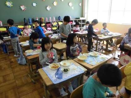初めてのことに戸惑いながらも,配膳が済んで「いただきます!」