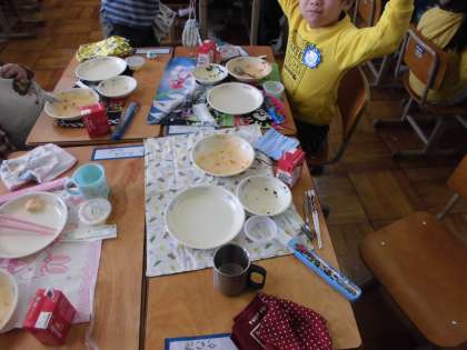 うれしそうにパクパク食べ,あっという間に食器がからっぽになっている子もいます。口の周りについたケチャップが微笑ましいです・・・。