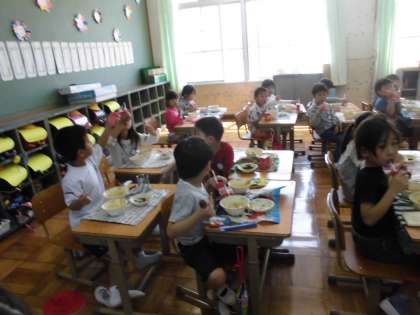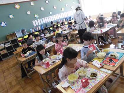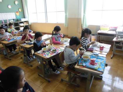 教室をのぞくと,1年生も大喜びで食べていました。