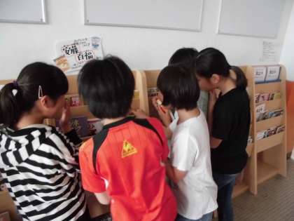 休み時間には子どもたちがやって来て,本を手に取っています。