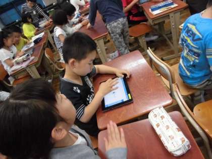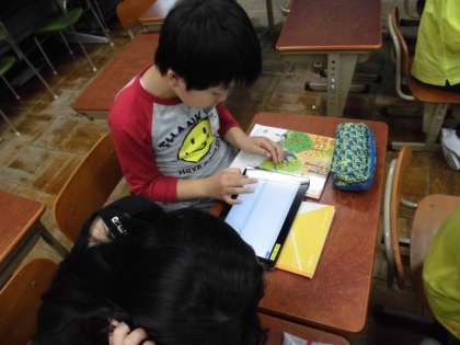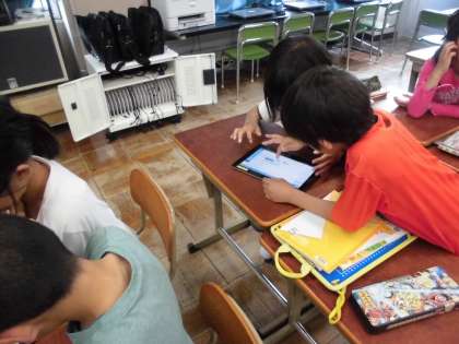 さて,コンピュータルームでは,4年生が「タブレット」を使って学習していました。子どもの方がすぐに扱いに慣れるようで,サクサク使いこなしています。