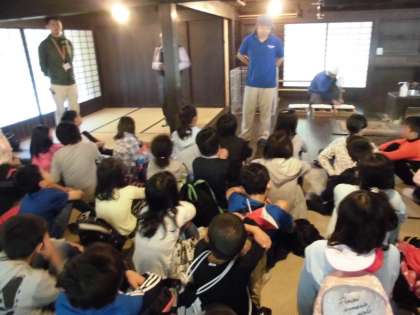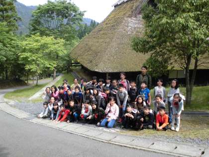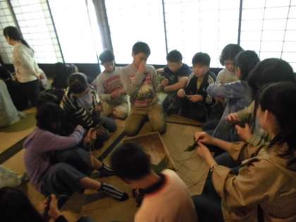 朝食後は,かやぶきの建物「北山民家」でのちまきづくりです。