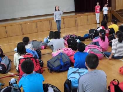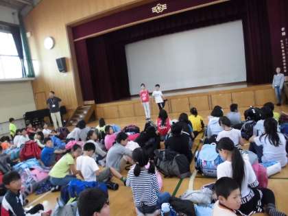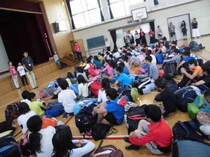 学校に着いて体育館に入った子どもたち。さすがに疲れたようで,ぐったりとしていました。4日間あれだけ活発に活動し続けたのですから,仕方ありませんね。
