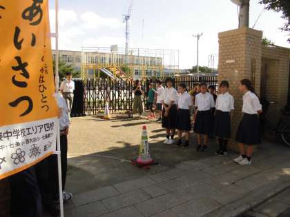 校門では,中学1年生による「本気のあいさつ運動」も再開です。