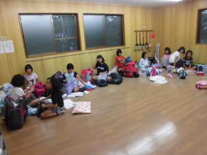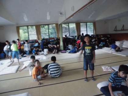 朝は,まだ薄暗いうちから起きている子も多く,すでに寝具の後片付けを始めていました。