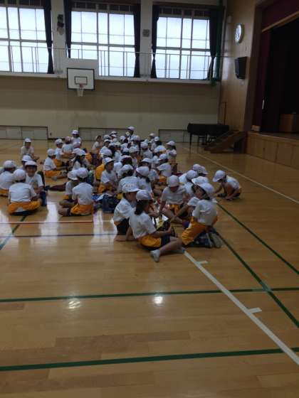 子どもたちは集合後,帽子に名札をつけたり,オレンジのエプロンをつけたりして準備を進めました。