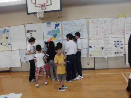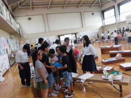 体育館では,中学生を含めたたてわりグループのメンバーに,自分の作品を紹介します。
