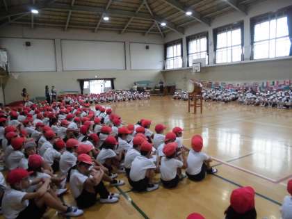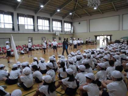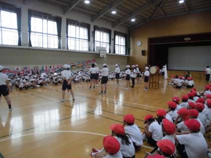 ただ,ポツポツ雨が落ちていたので,少し予定を変更し,体育館での応援練習から始めました。