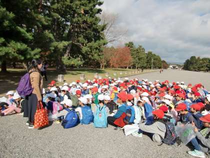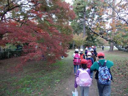 1・2年生合同で『秋みつけ』をしに,京都御苑に出かけました。落ち葉やどんぐり,松ぼっくりなどがたくさんあり,子どもたちも大喜びでした。1・2年生のなかよしペアになって歩き,たくさんの秋を見つけることができました。