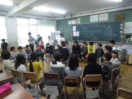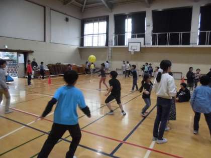 児童集会の後,たてわりグループごとに,教室・体育館・運動場に分かれて活動しました。運動場のグループ は,突然の雨で予定していた遊びができず残念でしたが,どのグループも高学年が中心になって遊びをリードしていました。ふだんできない異学年との交流を楽しんでいました。