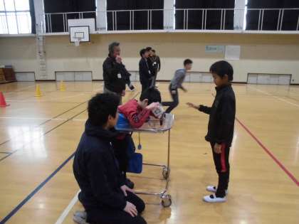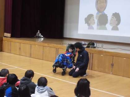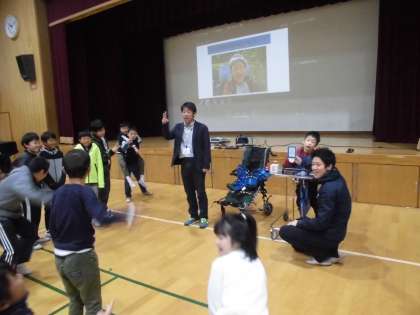 始めに,東総合支援学校での学校生活の様子をクイズをまじえながら紹介してくれました。その後,「ジャンケン大会」「猛獣狩りに行こうよ」「ジャンケンリレー」のゲームをして楽しみました。