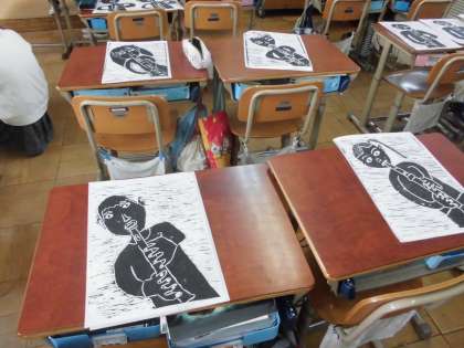 4年生の図画工作科では,初めての木版画に挑戦しました。彫刻刀を使って少しずつ彫っていきました。作品は,リコーダーを吹く自分の姿を描いています。先週,版画が刷り上がり,今週は友達の作品を鑑賞しました。どの作品もきれいに刷り上がり,子どもたちも嬉しそうでした。