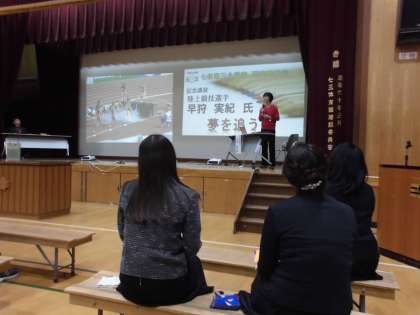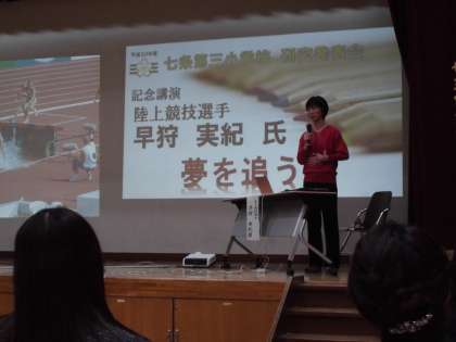 授業後の全体会では,京都ゆかりの陸上競技選手である早狩実紀氏をお招きし,記念講演をしていただきました。
