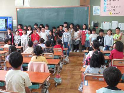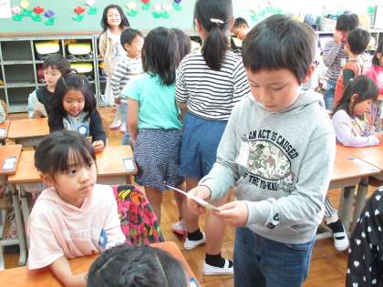 9日(木)に,2年生が1年生の教室を訪問しました。目的は「あさがおの種のプレゼント」をわたすことです。この種は,昨年度,自分たちが大切に育てたあさがおの花からとれたもので,新しい1年生のためにメッセージを書いた手作りの封筒に入れてわたしました。「たねをまいたら,水をしっかりあげてね。」「きれいな花をさかせてね。」「何色の花がさくかは,お楽しみ。」など,一人一人,言葉をそえながら,種のプレゼントを手わたしました。1年生は早速,種をじっくり見たようで,昼休みに廊下ですれちがった2年生に「おむすびみたいな形をしていたよ。」「黒くて小さかった。」など,お話をしてくれました。昨年度のあさがおの種から,また,命が受け継がれていくとうれしいです。