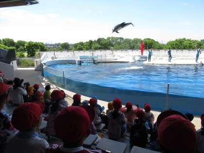 歩いて水族館に向かい,まずはイルカショーを観覧しました。イルカが空高くジャンプすると,「すごい!」,「こっちにも来て!」と子どもたちは大興奮でした。