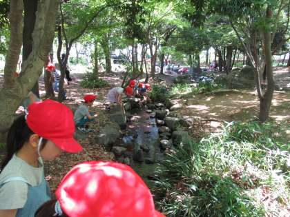 水族館を見学した後は梅小路公園に移動し,待ちに待ったお弁当を食べました。グループごとにお弁当を食べ,食べ終わった子たちは,芝生で鬼ごっこをしたり,近くの川で生き物探しをしたりして過ごしていました。