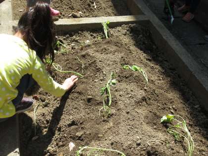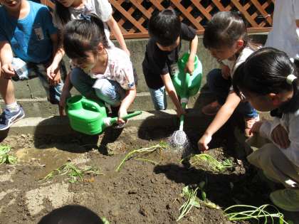 先日,サツマイモの苗を植えました。班に1本ずつの苗ですが,大事に手に取り,優しく植える姿が見られました。植えた後には,たっぷりとお水をあげました。「はやくサツマイモができるといいな。」,「サツマイモ掘りはいつするの?」と,今から収穫が楽しみな様子です。班ごとに協力して,水やりも頑張っています。