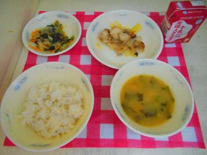 6月6日(木)の給食は,麦ごはん・牛乳・鶏肉のてり焼き・小松菜と切干大根の煮びたし・みそ汁でした。