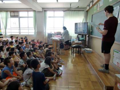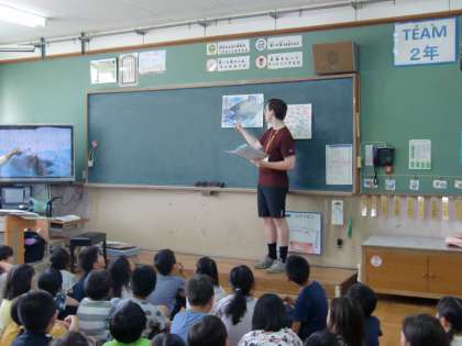 2年生は今,国語科で「スイミー」の学習をしています。先日,「図書室でスイミーの絵本を見つけたよ!」と子どもたちが見つけたものは,英語で書かれたものでした。「自分たちでは読めないなあ・・・。でも読みたいなあ・・・。」という子どもたちの声を聞き,2年生の教室にALTの先生が来てくださりました。挿絵と比べながら,「ビッグフィッシュって大きな魚のことだね!」と,楽しみながらお話を聞いていました。