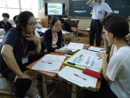 授業後,事後研究会で本校が目指している「3つの山場」を視点に,