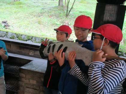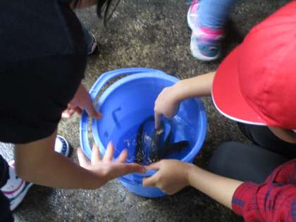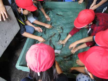 あいにくの雨のため,おがま池で魚つかみを行うことができず,