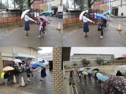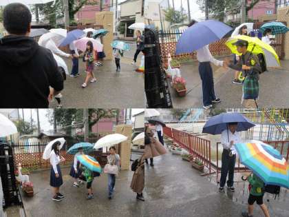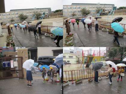 初日はあいにくの雨でしたが,中学生も少し背をかがめて