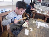 図画工作科の学習で金づちを使って,木片にくぎを打って作品を作っています。最初は,金づちの柄の真ん中を持って軽くトントントンと打って釘を固定し,次に柄の下の方を持って金づちの重さを感じながら打って,安全に使えるように気を付けています。みんな,とても真剣に黙々と取り組んでいます。木片の厚さと釘の長さの関係をつかむのが難しく,初めて使う金づちに苦戦している子もいますが,何とか来週にはカラー輪ゴムで飾って完成させたいと思います。