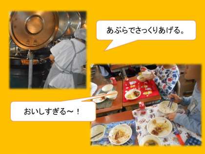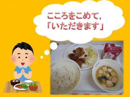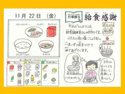 11月22日は「給食感謝」献立でした。「ヒレカツ」は給食室で,一つひとつ丁寧に衣をつけて,油で揚げています。手作りのおいしさを味わって,調理員さんや給食に関わる人へ感謝しながら食べてほしいです。朝から楽しみにしていた子どもたちは,給食室から香ばしいにおいがすると「お腹すいた!早く食べたい!」と待ちきれない様子でした。給食時間には「衣もほしい!」「おいしすぎる〜」と目を閉じて味わっている子どももいいました。どのクラスも完食で,ピカピカの食缶を見れてうれしいです。