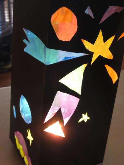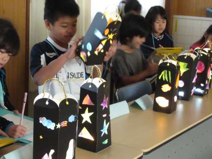 2年生は,12月,図工科の学習で「光の プレゼント」という工作に取り組みました。この単元の学習で,初めて,カッターナイフを使うことにチャレンジしました。どの子も,緊張した面持ちで,真剣に,厚紙をカッターナイフで切っていました。さて,23日(月)は,学年みんなの作品を鑑賞する日でした。会議室を使ってカーテンを閉め,組み立てた作品の中に小さなライトを入れて灯すと,「わあ,すごい。」「きれい。」と,歓声があがりました。初めて,カッターナイフを使って懸命に仕上げた作品です。おうちで,ぜひ,かざってくださいね。
