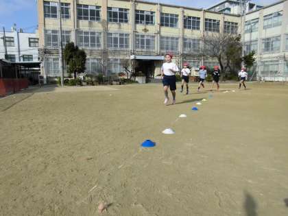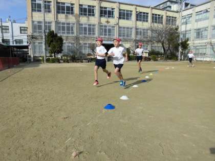 体育では,「持久走」に取り組んでいます。5分間,自分の走ることのできるペースで一生懸命走っています。走っている人に,記録をしている人がたくさん声をかけて応援しています。走っていると少しずつ苦しくなってきますが,みんなの応援が嬉しいですね。