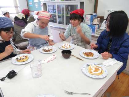 今年度のクラブ活動も,2月の最終回を残すのみとなりました。20日(月),手芸・料理クラブでは,2回目のクッキングを実施しました。この日は「パンケーキ」にチャレンジ。45分間という短い活動時間の中で,材料を手早く混ぜ合わせ,フライパンで上手に焼き上げていて,感心しました。家庭科室の中は,パンケーキの甘いいい香りでいっぱいに…。バターをのせたりホイップで飾り付けたりして,みんなおいしそうに食べていました。おうちでも,またチャレンジしてほしいです。