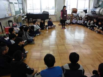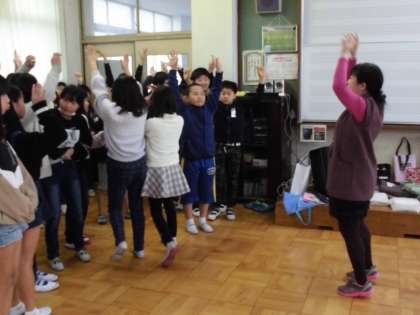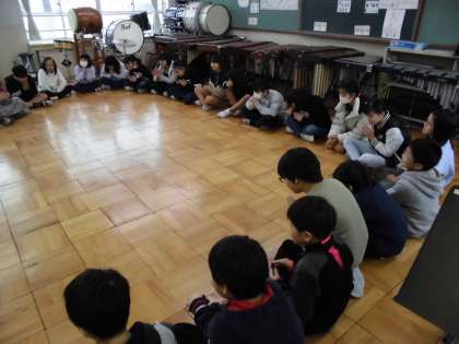 音楽科の学習では,前回の授業で色々な国の音楽を鑑賞しました。その中でインドネシアのバリ島で行われている合唱と踊りの「ケチャ」というものがありました。今日の学習の最後に,実際にどのようにして歌いながら踊っているのかをみんなでやってみました。