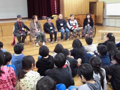月曜日の3・4校時に車いす体験を行いました。最初に,肢体障がい者の方から実際にどのように普段生活されているのか,工夫や困りなどをお話していいただきました。「もしも町で困っている人に出会ったら,まずは一声かける勇気をもってくださいね」というお話から,「これからは自分から声をかけよう!」「ヘルプマークを見かけたら席をゆずろう」など,これからの行動について考えられていました。
