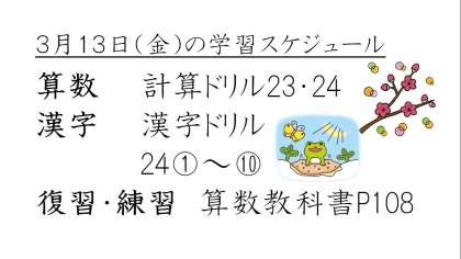 3年生のみなさん。元気にすごしていますか?家の中でからだを動かせていますか?軽くストレッチをするだけでも,からだが楽になりますよ。やってみてください。明日の学習のお知らせです。やりっぱなしにならないように,その日の分は,その日のうちにまるつけをしましょうね。