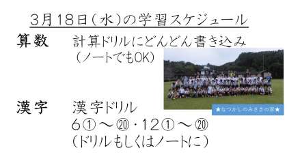 4年生のみなさん,今日も元気に過ごしていますか?課題は順調に進んでいますか?課題が終わったら,1・2学期のドリルに書きこみをしたり,これまでの漢字・計算の復習に取り組んだりと自分で課題を見つけて,5年生にそなえましょう。自学の力を高めるチャンスですよ!もちろん,手洗いうがいをしっかりと!