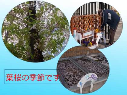 桜(さくら)の 花(はな)びらも 散(ち)り,「メダカの学校(がっこう)」が,ピンクのじゅうたん を しいたように,美(うつく)しいです。