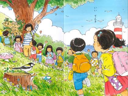 「いい てんき」…大勢の子どもたちが,リュックサックを背負って楽しそうに歩いていますね。ここはどこかな。これから,みんなで,どこへ行くのかな。おや,大きな木のそばに看板があるね…。次のページをめくってみると……。教科書の絵を見ながら,「見つけたもの」「気が付いたこと」「思ったこと」などを,おうちの人とたくさんお話してみましょう。