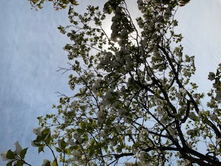 みなさん,学校では今ハナミズキの花が咲いています。今朝は青空と白いハナミズキのコントラストが美しく,写真を撮りました。外出する機会が少ないと思いますが,散歩などをした時には,春のたよりを見つけてみてくださいね。