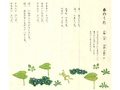 国語の教科書にも,12〜13ページに草野心平さんの詩「春のうた」が載っています。音読の宿題には出していませんが,場面の様子を思い浮かべたり,かえるの気持ちを想像したりしながら音読してみてください。