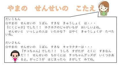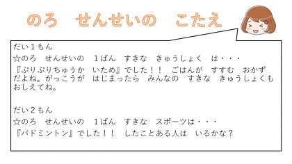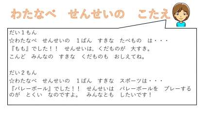 では, いまから こたえを はっぴょうします!! ぜんもん せいかいの 人は いるかな? せんせいと おなじ ものが すきな人はいるかな?