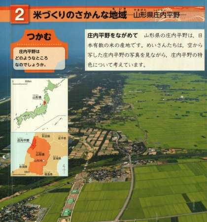 教科書では,山形県の庄内平野の米づくりを勉強します。
