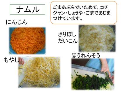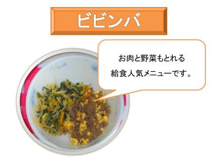 おうち過ごす時間が多くなる中,毎回の食事のご準備も大変かと思います。今回は,給食の人気メニュー「ビビンバ」の作り方を紹介します。キムチと一緒にごはんにのせて食べていただいたり,おにぎりや海苔巻きの具にしていただいたりしても,おいしく食べられます。