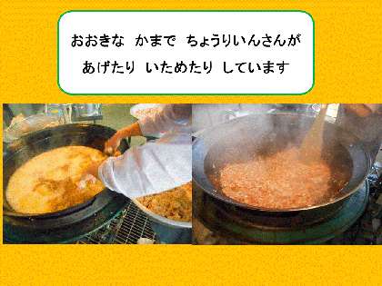 1ねんせいの みなさん げんきに すごして いますか。4がつ 30にちの くいずの こたえは 「きゅうしょくしつ」 でした。たくさんの やさいを きったり おおきな かまで にくを いためたり さかなを あげたり しています。きゅうしょくしつでは 4にんの ちょうりいんさんが 480にんぶんの きゅうしょくを こころを こめて つくって います。きゅうしょくでは てづくりの おいしい かれぇや はるまきなどが でてきます。たのしみ していてね。
