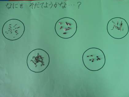 丸い種,細長い種,いろいろな形の種がありますね。もようが入っている種もあるね。見たことのある種もありますか。何の花の種でしょう……。今,おうちで花を育てている人もいると思いますが,学校の花壇に,この5種類の種をまいて,1年生の花を育てたいなと思っています。