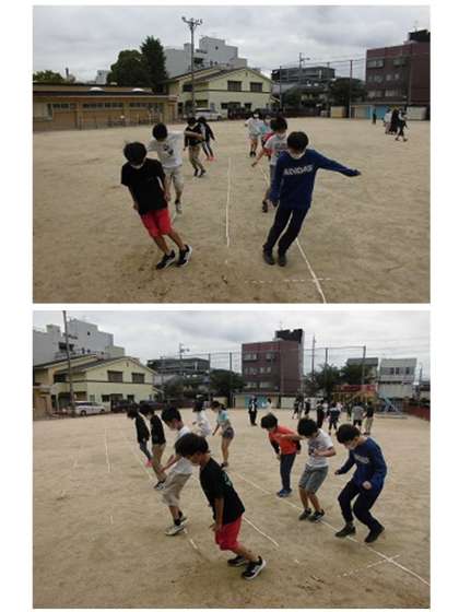 今日は健康観察をしてから,運動場でストレッチやサイドステップ,大縄跳びをして体を動かしました。