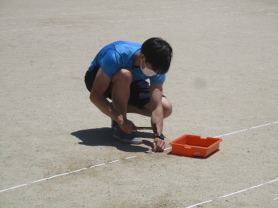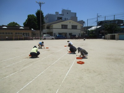 きれいに晴れ,夏の足音が聞こえてきそうな空の下,グラウンドのラインテープを補修しました。